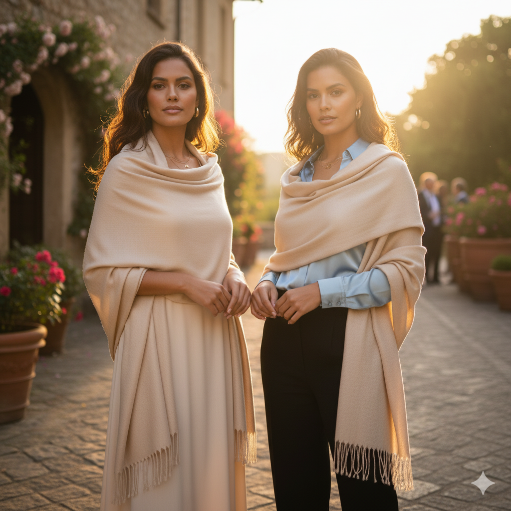 Uma das grandes tendências de 2026 é o luxo funcional. As pashminas deixam de ser apenas decorativas e passam a atender necessidades reais: proteger do frio em cerimônias noturnas, eventos ao ar livre ou locais climatizados, sem comprometer o visual.